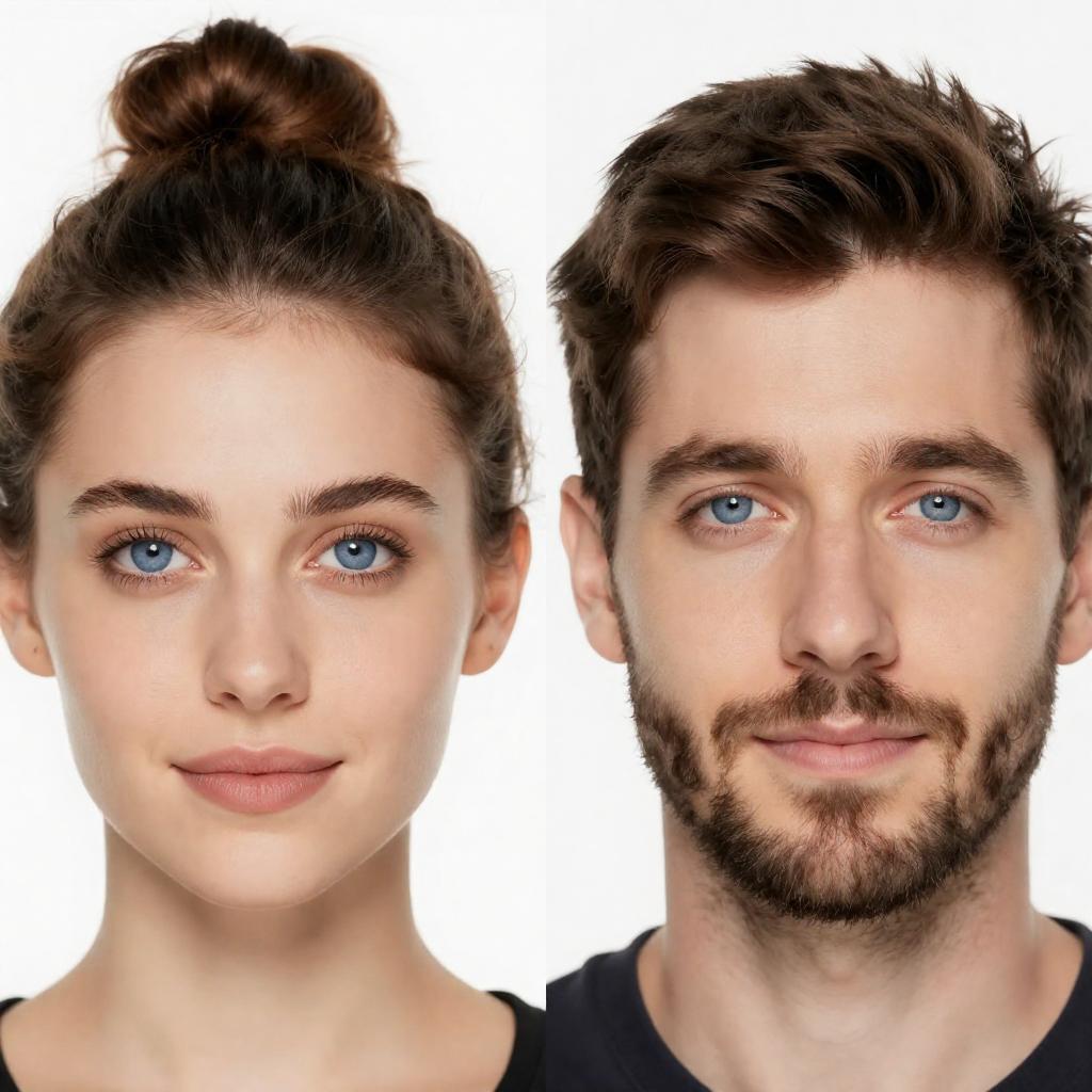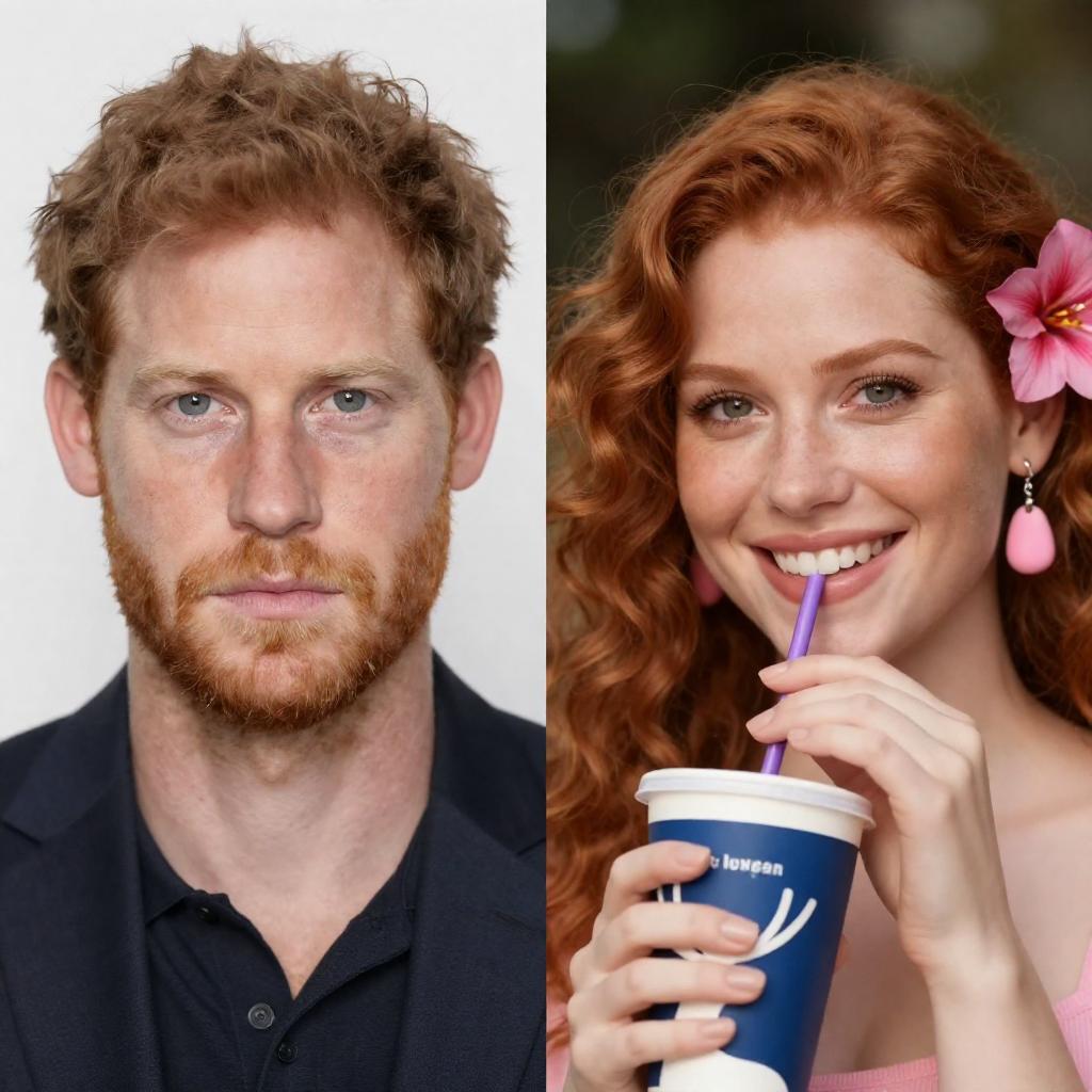 Photograph of two close-up portraits. Left: serious, Caucasian man with short brown hair, blue eyes, and light stubble, wearing a dark suit. Right: smiling, Caucasian woman with curly red hair, pink flower, pink earrings, drinking from a blue and white cup with a purple straw. Woman looks to the left, man looks forward.