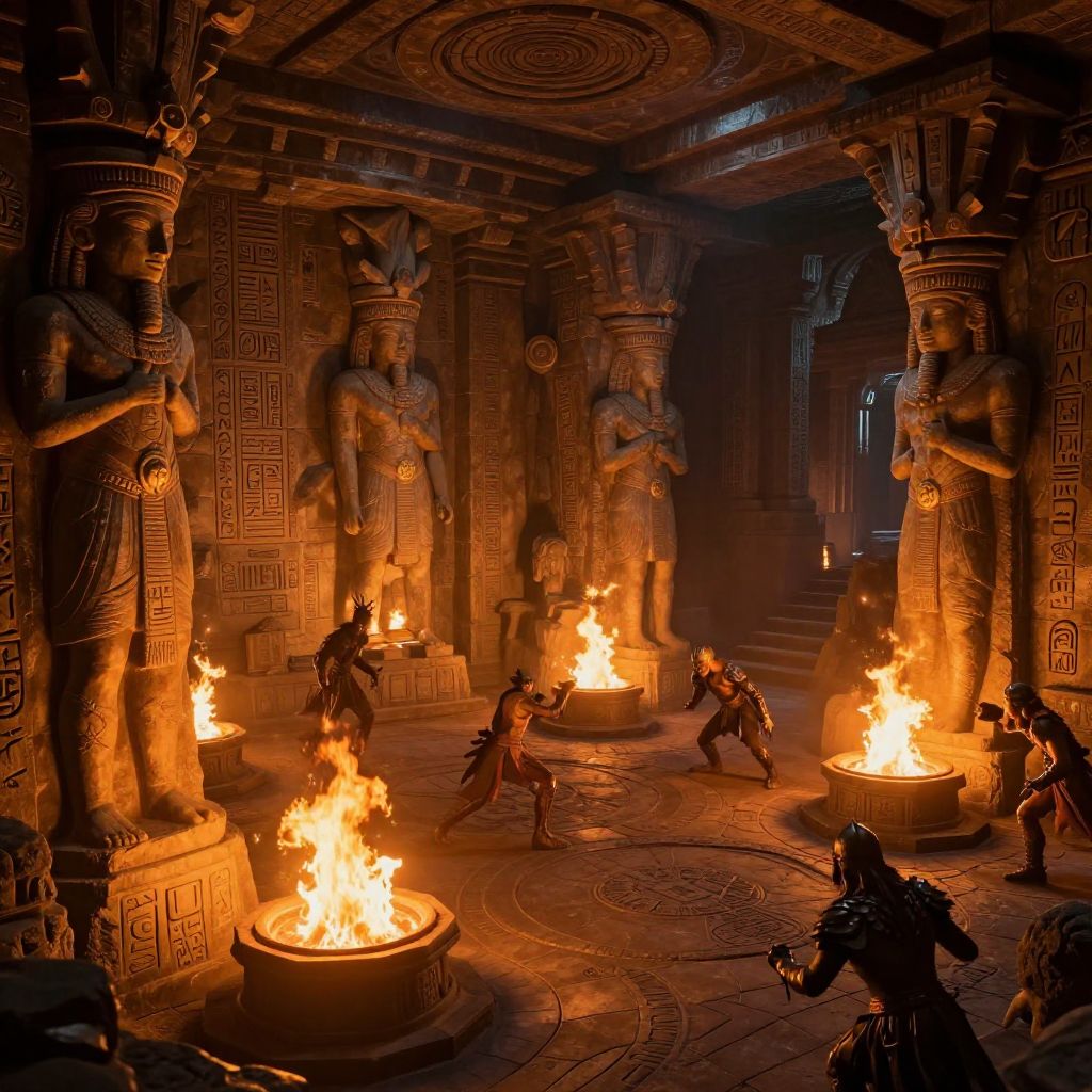 Fantasy dungeon art featuring a subterranean temple chamber with giant stone statues, enchanted fire pits illuminating the room with a warm glow, carved hieroglyphics telling lost legends, heroic figures battling shadow creatures, dramatic dynamic composition