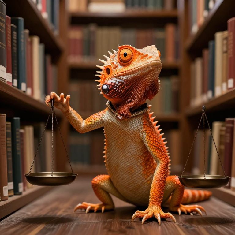 Digital illustration of a cartoonish, orange-and-yellow, spiked gecko with large, expressive eyes, sitting on a wooden library floor. The gecko wears a black collar and balances two suspended scales in its right hand, symbolizing justice. The background features blurred bookshelves filled with various books, creating a warm, wooden, library atmosphere. The gecko's textured skin is detailed, with prominent spikes on its back and head, adding a playful yet authoritative touch to the scene. The image blends whimsical cartoon style with realistic textures.