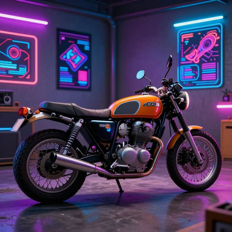 A c650 motorbike in a retro-futuristic style garage, surrounded by neon lights and holographic posters, merging vintage and cyberpunk themes, high detail, glowing accents, dramatic shadows