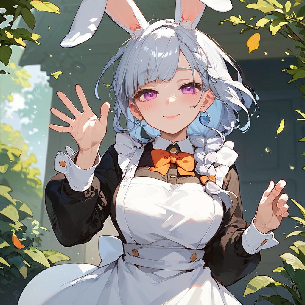 Score_9, score_8_up, score_7_up, score_6_up, score_5_up, score_4_up, rating_questionable, source_anime, digital illustration, pixiv, fanbox, uncensored, , official art, 1girl, solo, mature female, pekomama, blue white hair, thick eyebrows, bunny-shaped pupils, rabbit ears, single braid, hair over shoulder, white dress, apron, orange bow, black body suit, upper body, outdoors, one hand up, close up, waving, light smile, blush, looking at viewer, cowboy shot