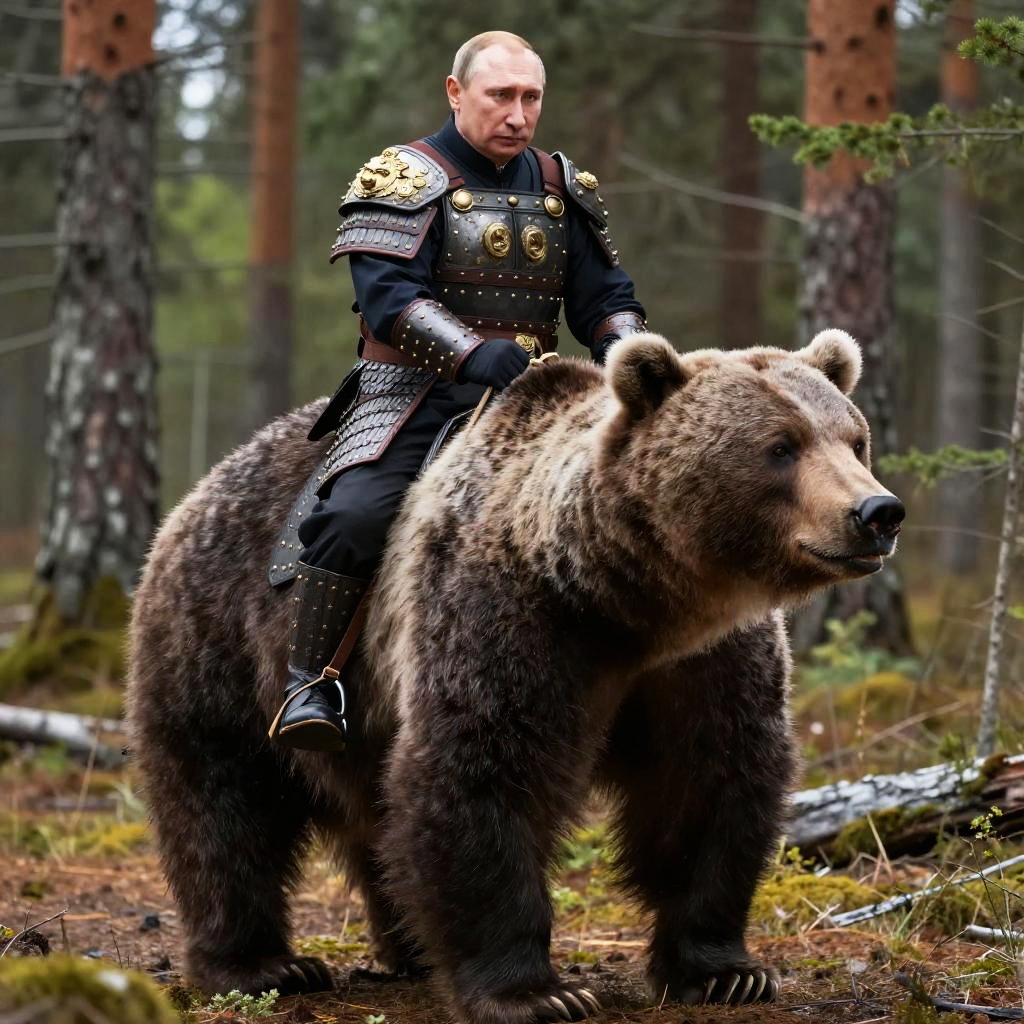 Putin on bear, action-packed graphic novel style scene showing Vladimir Putin battling enemies while riding a massive black bear, dynamic poses, bold shadows, intense energy, vivid palette