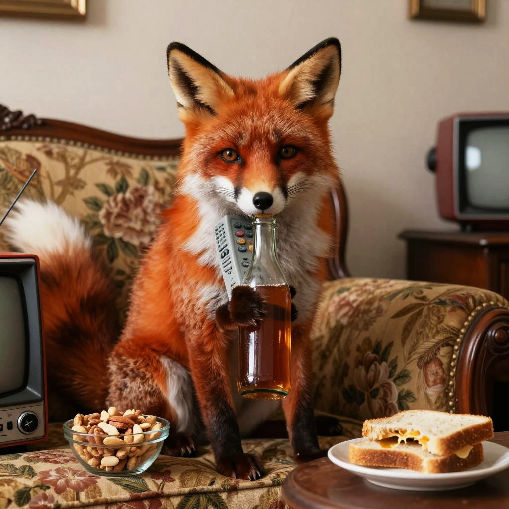Elderly anthropomorphic fox, rich red with white muzzle fur, bushy tail with white tip sitting on a vintage floral couch, holding a glass bottle and retro TV remote, sipping from the bottle, warm, knowing look directed at the viewer, bowl of mixed nuts and half-eaten sandwich on a side table