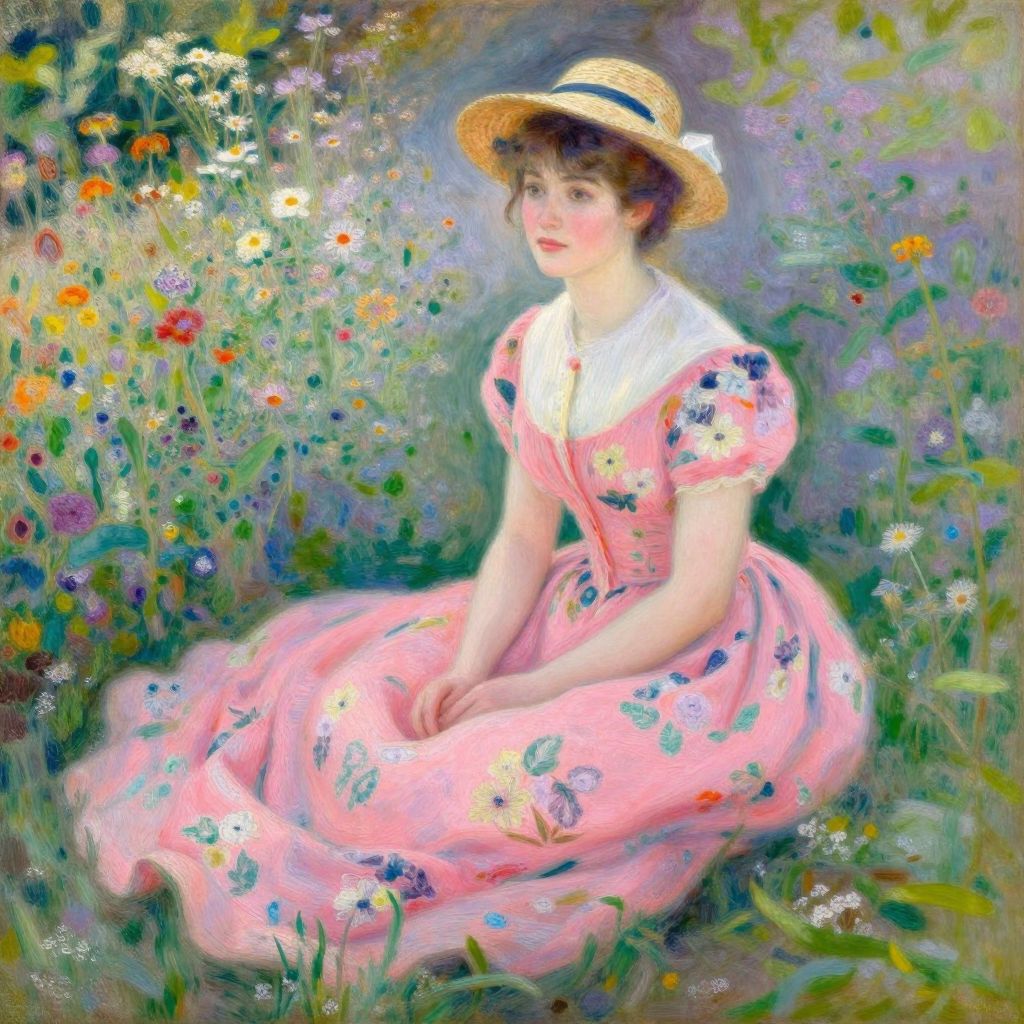 A serene digital illustration inspired by Impressionist painter Berthe Morisot, featuring a woman in a vibrant pink floral dress and straw hat, seated amidst a lush garden of wildflowers under soft, vintage-inspired lighting.