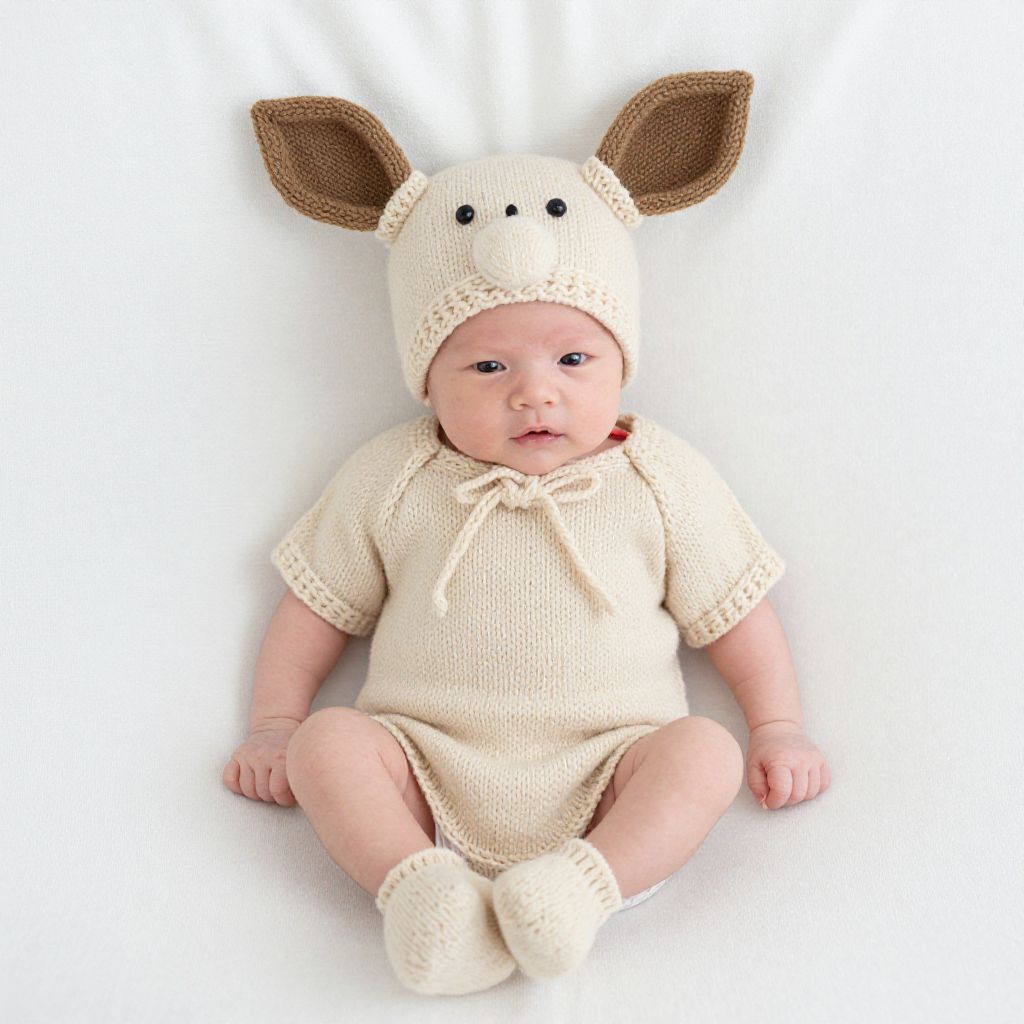 Photograph of a baby with light skin and blue eyes, sitting against a white background. The baby is wearing a cream-colored, knitted onesie with short sleeves and a small bow at the chest. The onesie has a playful, animal-themed hat with large, brown, ear-like extensions and black, round eyes. The baby also wears matching cream-colored, knitted socks. The baby's legs are slightly apart, and their hands rest on the floor. The texture of the knit fabric appears soft and cozy, contrasting with the baby's smooth skin. The overall style is cute and whimsical.