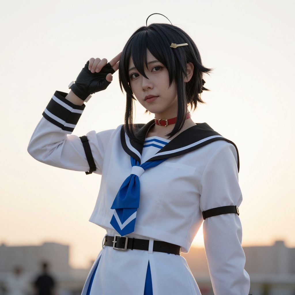 Photograph of an Asian woman with black hair in a white and blue sailor school uniform, black gloves, red choker, and black hairpin,