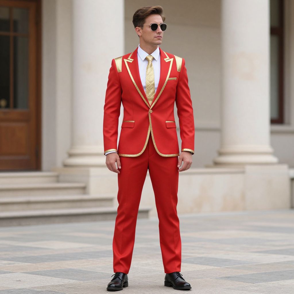 Photograph of a young white man standing confidently in a sunlit, stone-paved courtyard. He wears a vibrant, red, tailored suit with gold trim, a white dress shirt, and a gold-patterned tie. His dark brown hair is neatly styled, and he sports black, aviator-style sunglasses. He stands with his hands at his sides, wearing polished black dress shoes. The background features large white columns and a wooden door, suggesting a formal or historic building. The image has a bright, sunny atmosphere with sharp, vivid colors.