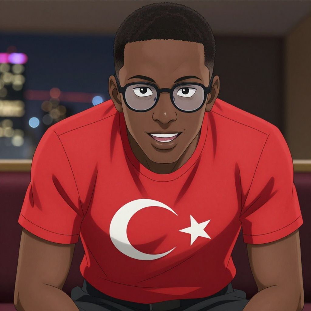 Digital illustration of a Black man with short hair, glasses, and a red Turkey-themed shirt, smiling indoors with a city night view blurred in the background