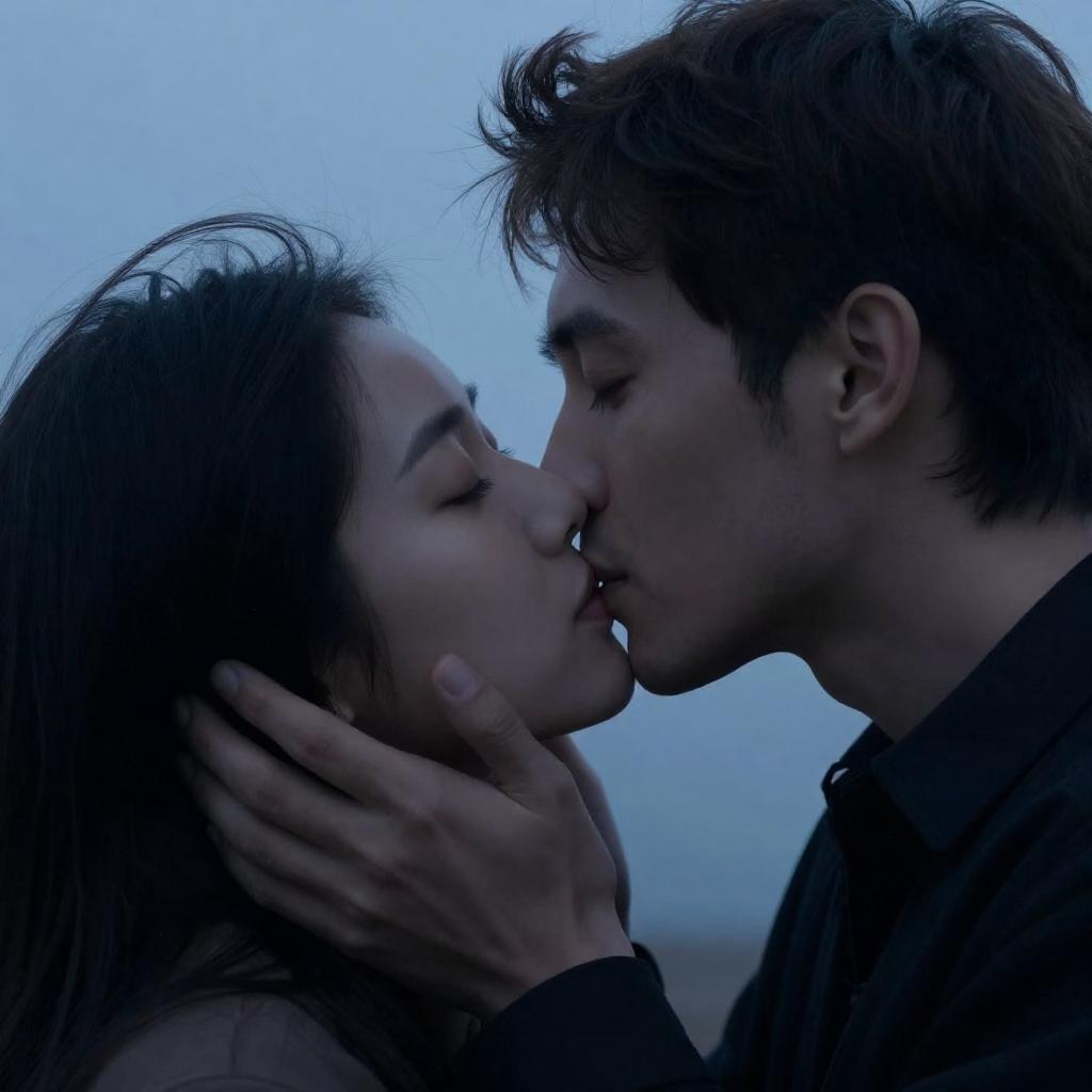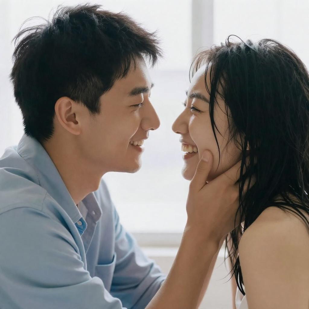 Photograph of a man and woman in a close, intimate moment. The man, with short dark hair and a gray shirt, gently holds the woman's chin as they lean in for a kiss. The woman, with long brown hair and a white top, has her eyes closed. The background is softly lit with a blue-toned blur, suggesting an indoor setting.