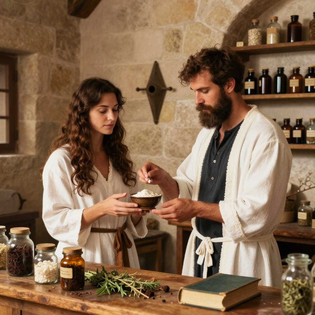 Photograph of a rustic apothecary scene with a bearded man and a woman with long brown hair, both wearing white robes over dark shirts. They stand in front of a wooden counter filled with jars, books, and herbs. The woman holds a small bowl while the man offers a pinch of powder. The background features stone walls and shelves filled with bottles. Warm, natural light illuminates the scene.