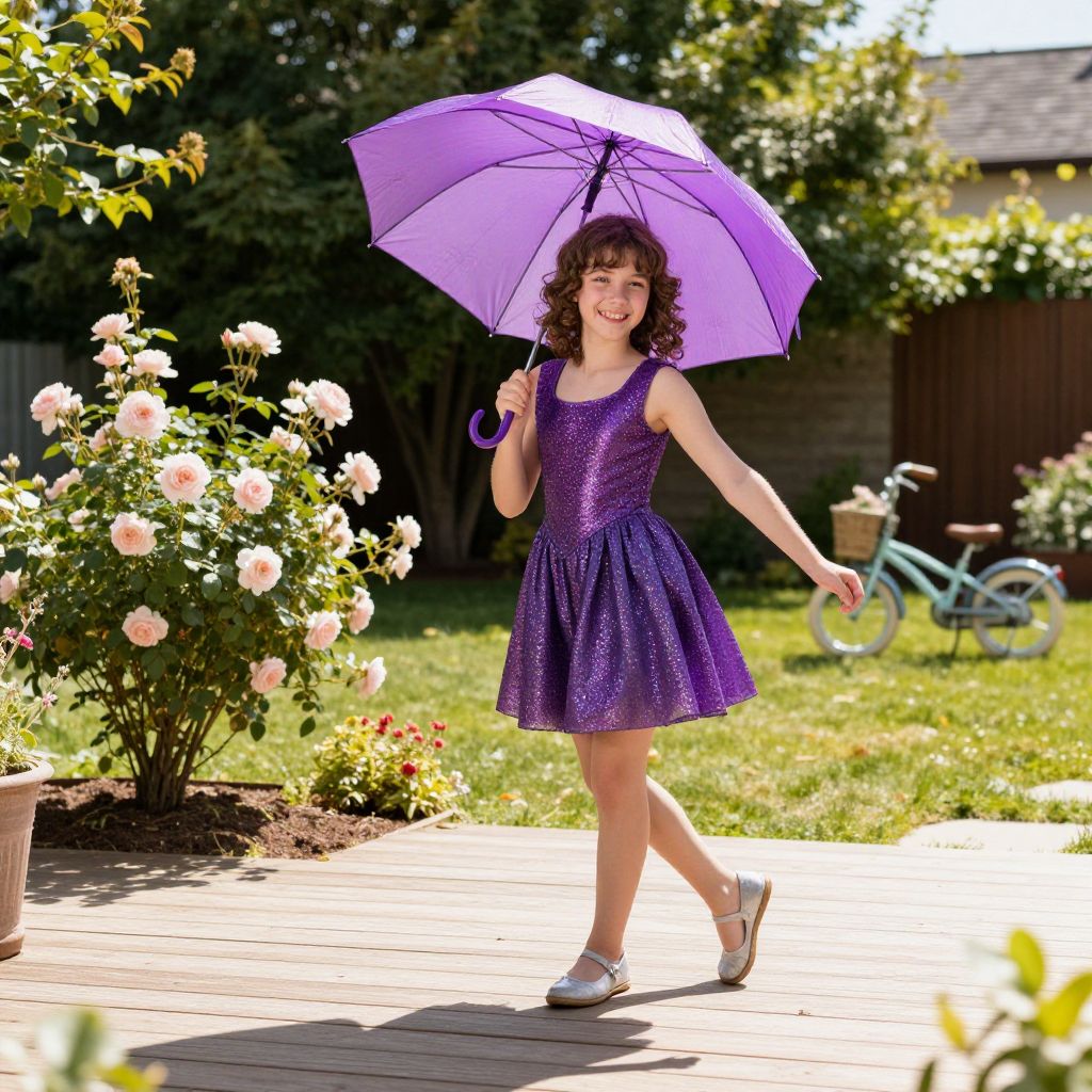 A playful teenager with curly brown hair and a smile, wearing a glittery purple umbrella frock costume, dancing on a wooden deck in a sunny summer backyard, with a small garden of roses and a child’s bicycle in the distance.