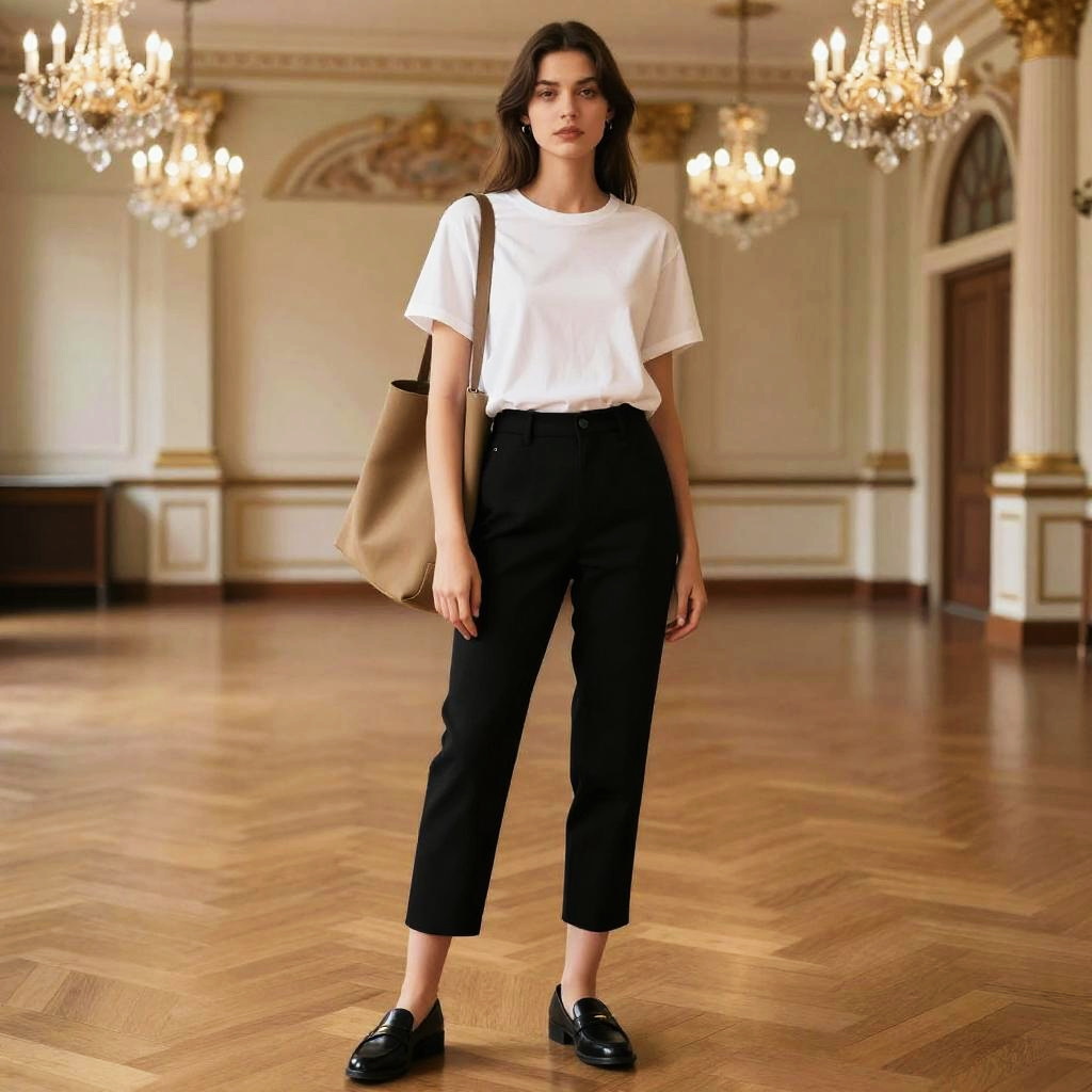 A willowy woman in a casual chic outfit, wearing a loose white t-shirt tucked into black cropped trousers, carries a khaki oversized shoulder tote bag and sports black leather loafers. Her natural makeup and straight long hair complement the scene. She stands in a historic ballroom with crystal chandeliers, exuding elegance in this refined setting. Sexy. Pretty face and beutiful eyes