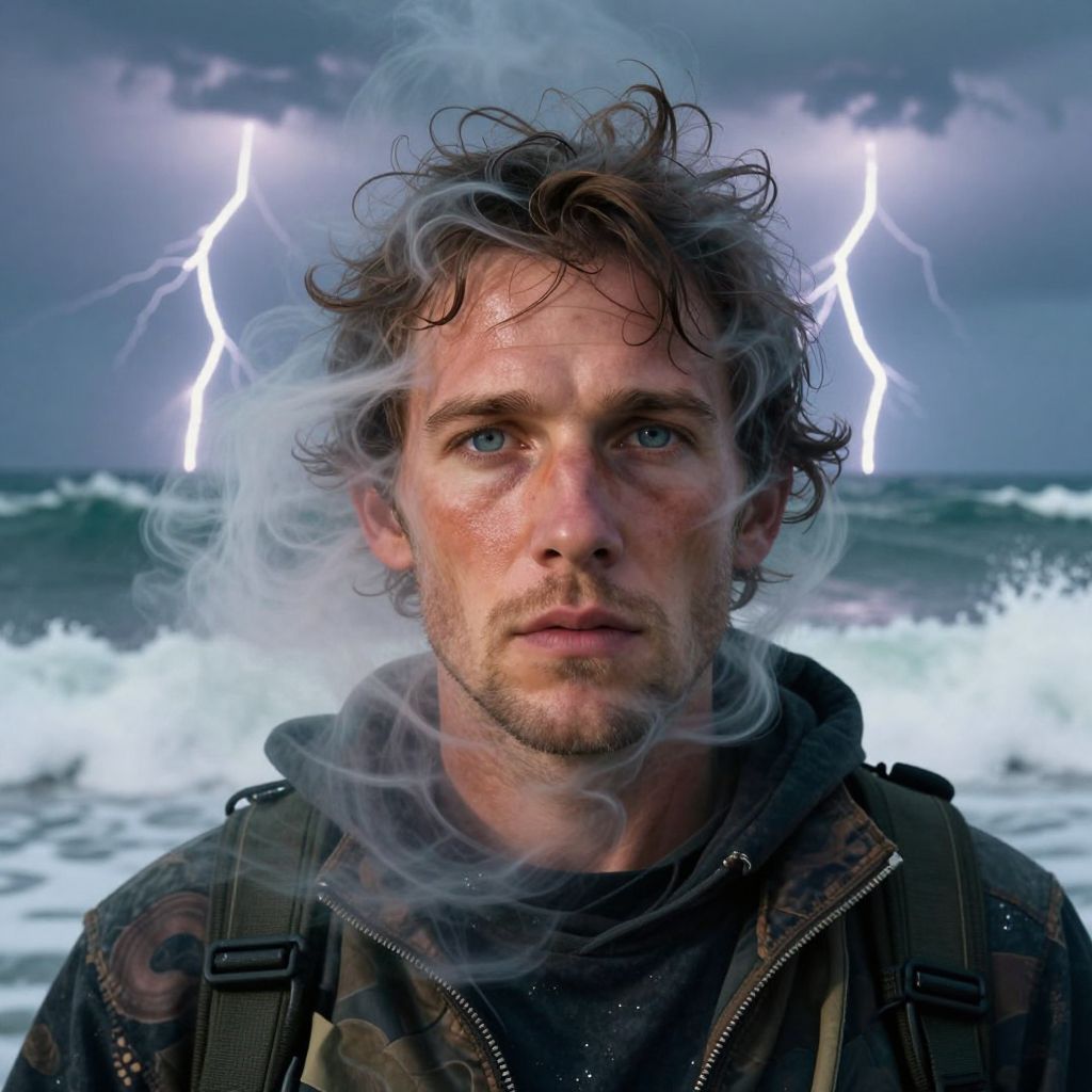 A photorealistic portrait photograph captures an eccentric tidal researcher with sun-kissed skin and piercing blue eyes, shot on film. A mysterious double exposure effect envelops his face, where swirling fog tendrils curl around his features like spectral tentacles, veiling parts of his rugged countenance in enigmatic mystery while revealing glimpses of his determined expression. Set against a tumultuous backdrop of churning waves and lightning-lit skies, the interplay between his silhouette and the ever-shifting mist evokes a sense of adventure and longing. Each element within this vivid double exposure is masterfully blended to convey an atmosphere of both despair and hope, capturing the raw essence of human resilience amidst nature's fury.