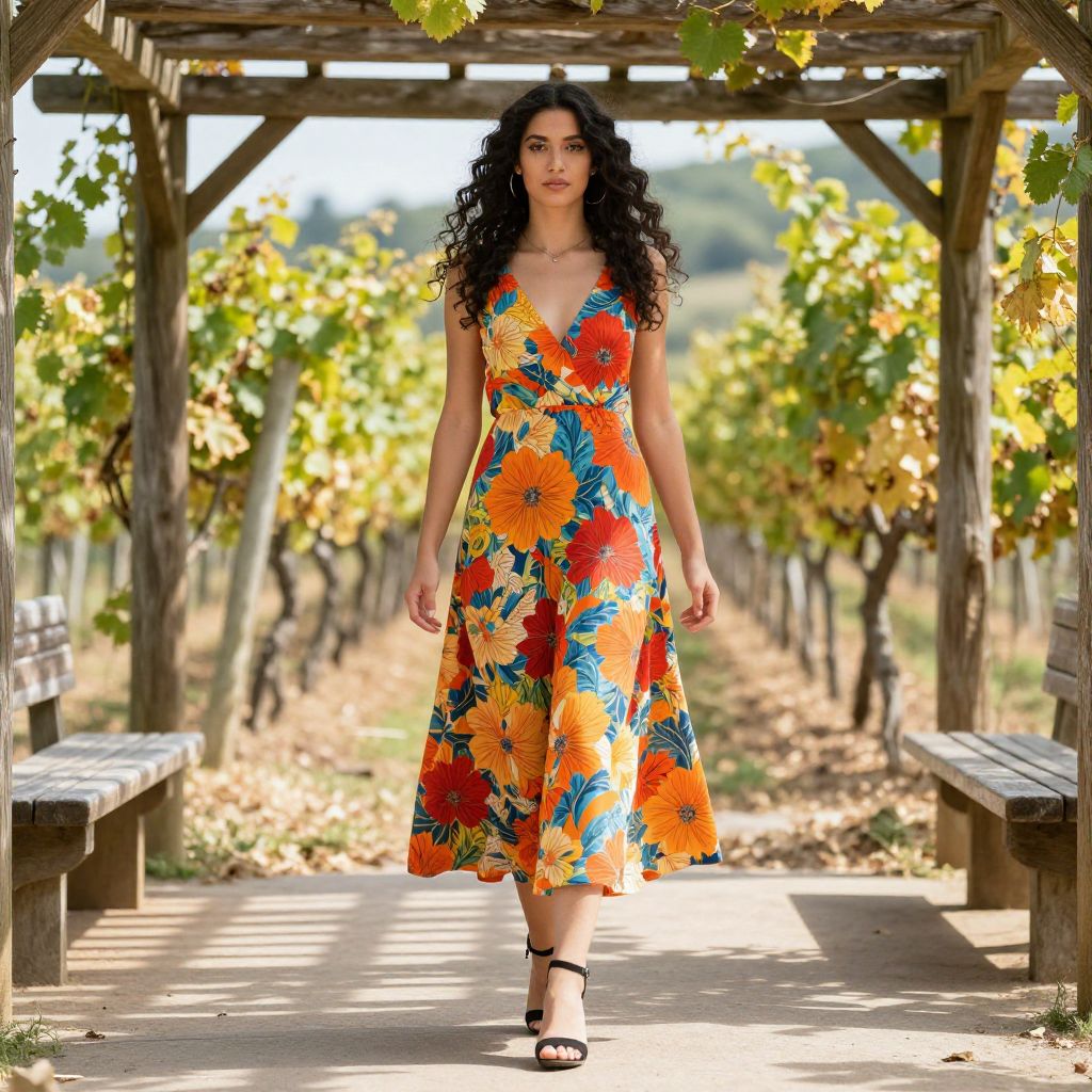 Photograph of a young woman with long, curly black hair walking confidently under a wooden pergola. She's wearing a colorful, sleeveless, V-neck dress with large floral patterns in orange, red, and yellow, paired with black high-heeled sandals. The background shows a sunlit vineyard with green and yellow grapevines. The ground is paved, and there are wooden benches on either side.
