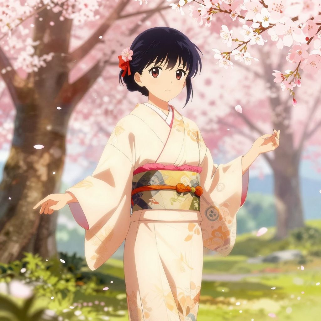 Anime trans girl wearing a flowing kimono in a serene cherry blossom garden, petals falling gently around her, traditional Japanese elements blended with modern anime style, vivid and warm tones
