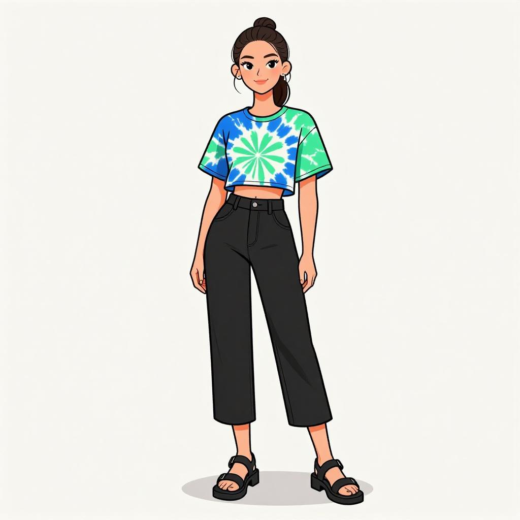 Woman with pretty face and pretty hair. smiling Woman, casual street style, green and blue tie-dye cropped t-shirt, high-waisted black culottes with button details, mid-calf length, chunky black sandals with buckles, minimalist makeup, simple ponytail, plain white studio background. --sref 1467