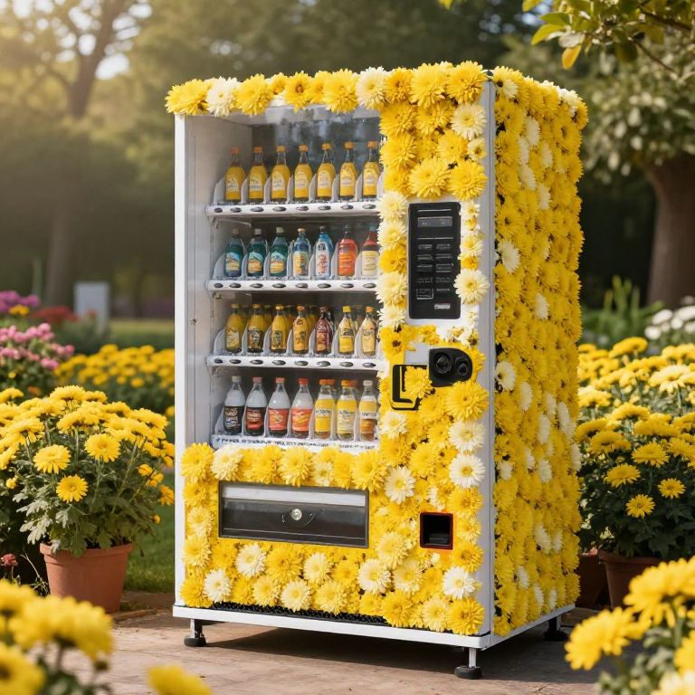 Record-Breaking a vending machine that is literally made of chrysanthemum flowers, standing in a flower garden, beautiful morning sunlight,
