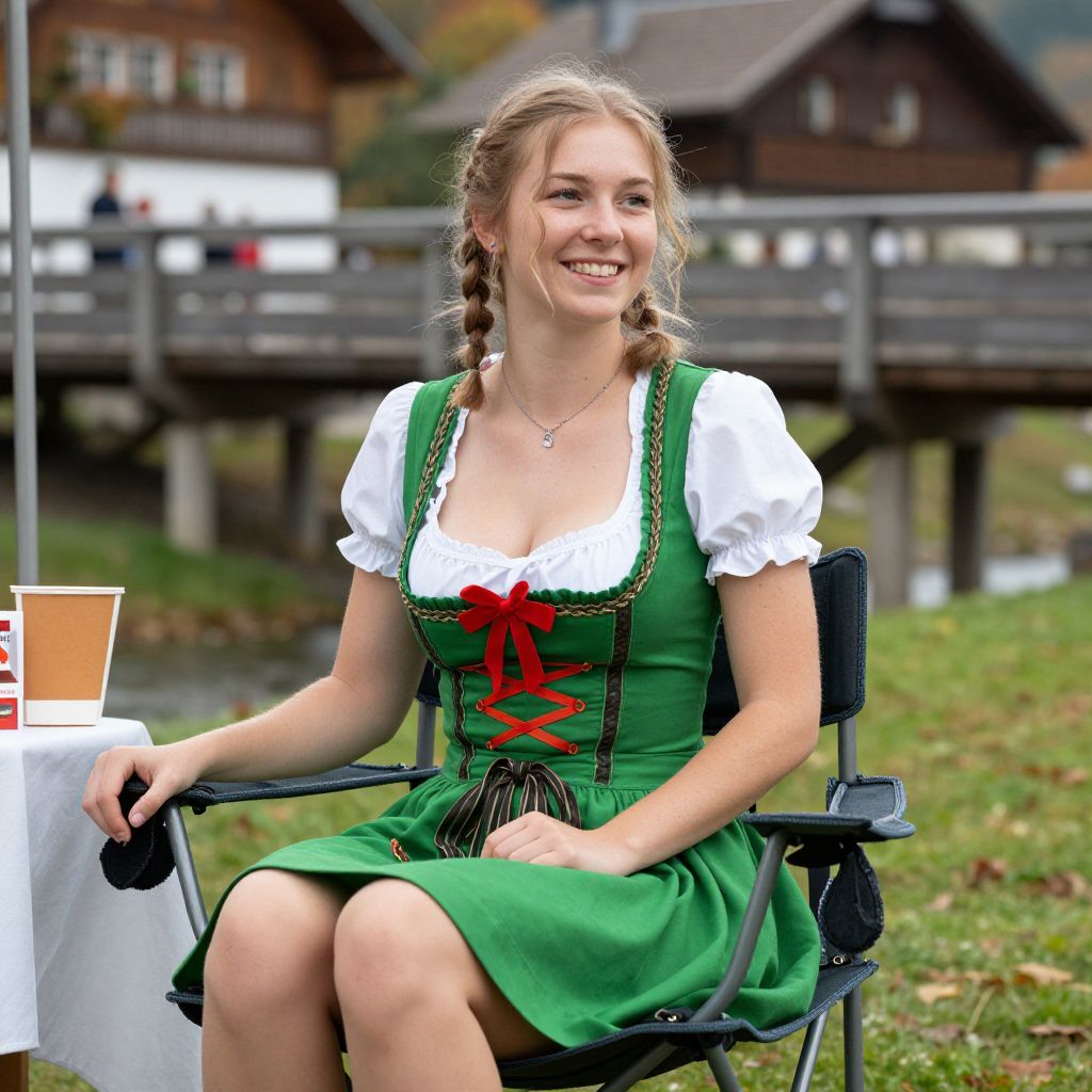 A candid moment of a woman dressed in a colorful green Oktoberfest costume, including a fitted green dress with a red bow in the front, her face has soft features and a natural smile, laughing while sitting on a folding chair at a street vendor near a wooden bridge in a Bavarian village during autumn season. The woman has big breasts and cute face
