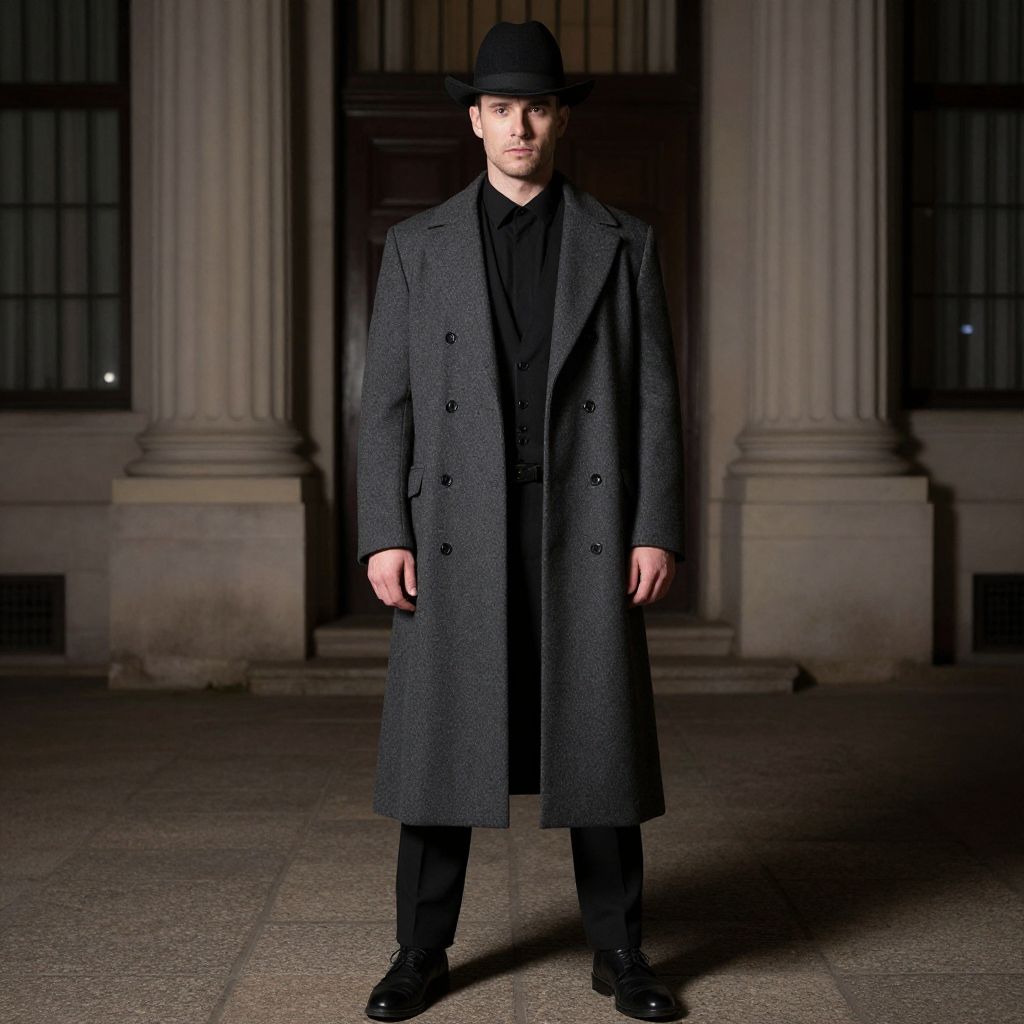 Photograph of a young Caucasian man standing in front of an old, stone building with tall, fluted columns and large, black-framed windows. He wears a black fedora, black shirt, and a long, dark gray overcoat with two rows of buttons. His black pants and shiny black shoes complete the outfit. The lighting is dramatic, casting shadows that highlight the textured fabric of his coat and the stone background. The overall style is reminiscent of noir or vintage detective fashion, with a mysterious and serious atmosphere.