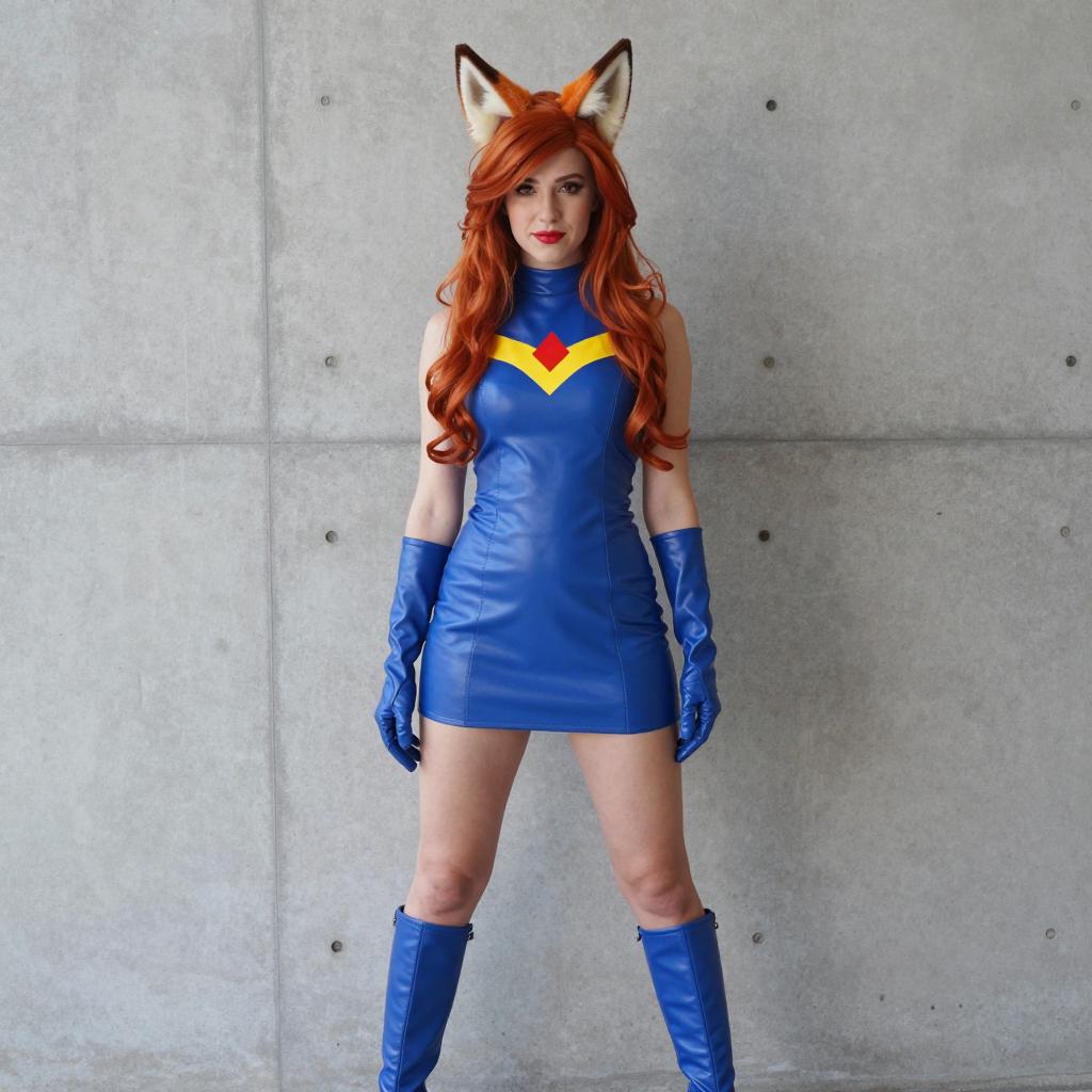 Swat kats cosplay, photograph of a woman in a Blue Marvel Comics costume, orange fox ears, long red hair, blue leather mini dress, yellow and red chest emblem, blue gloves, blue knee-high boots, standing against plain concrete wall, neutral lighting, cosplay, front view, full body, confident expression, casual pose, slightly shadowed background, natural skin tone