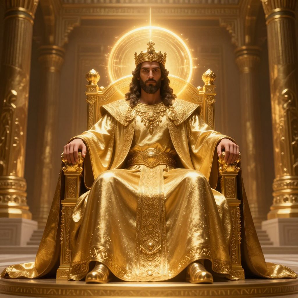 Photorealistic digital artwork of a bearded, long-haired man with a regal demeanor, seated on an ornate, golden throne. He wears a golden crown and a richly embroidered, gold-embroidered robe that matches the throne. The background features an opulent, golden-hued temple with illuminated columns. The man's serious expression and relaxed pose convey authority and wisdom. His hands rest on the throne's armrests, and a radiant halo-like glow surrounds his head, enhancing his majestic presence. The image exudes a sense of power and divine royalty.