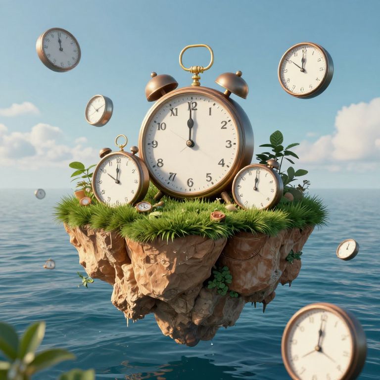 Digital artwork of a floating rock island with grass and six clocks, set in a blue ocean under a clear sky. Clocks vary sizes, some floating