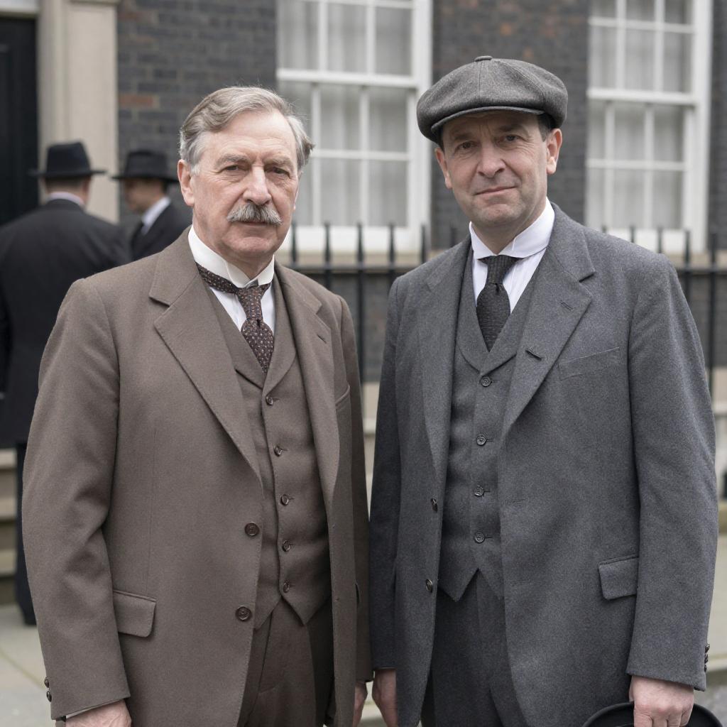 Portrait of two middle-aged Caucasian men dressed in early 20th-century formal attire standing outdoors in front of a brick building with white-framed windows. The man on the left wears a light brown three-piece suit with a patterned tie and has gray hair and a mustache. The man on the right wears a gray three-piece suit, a dark tie, and a matching flat cap, holding a gray hat in his hand. Both men have serious expressions, with the man on the right showing a slight smile. The background includes two men in black suits and hats near a black iron fence.