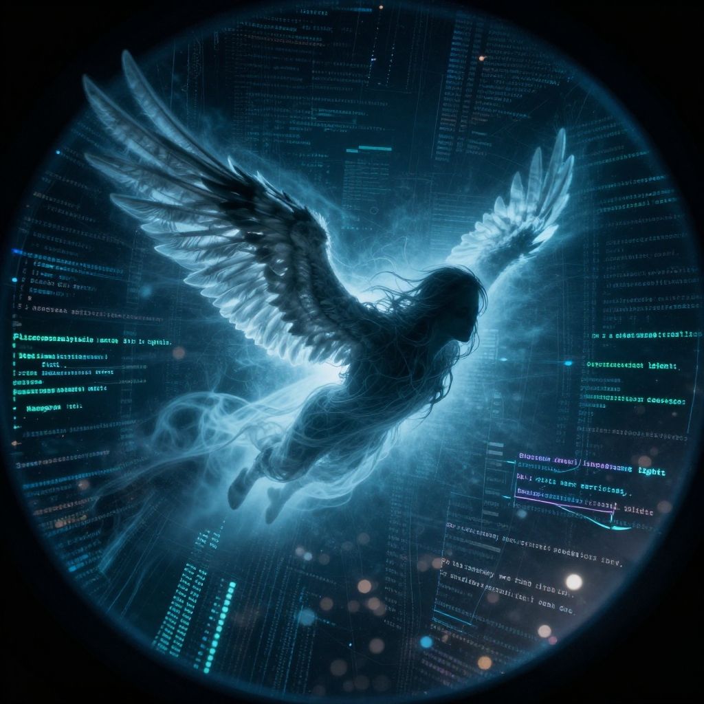Digital art of a glowing blue angel with outstretched wings, flying through a cybernetic background filled with luminous binary code.