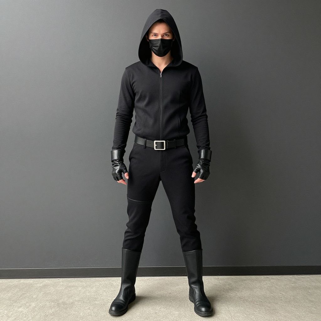 Area escapee costume adult, 1boy, solo, male focus, hood, gloves, boots, fingerless gloves, realistic, standing, full body, belt