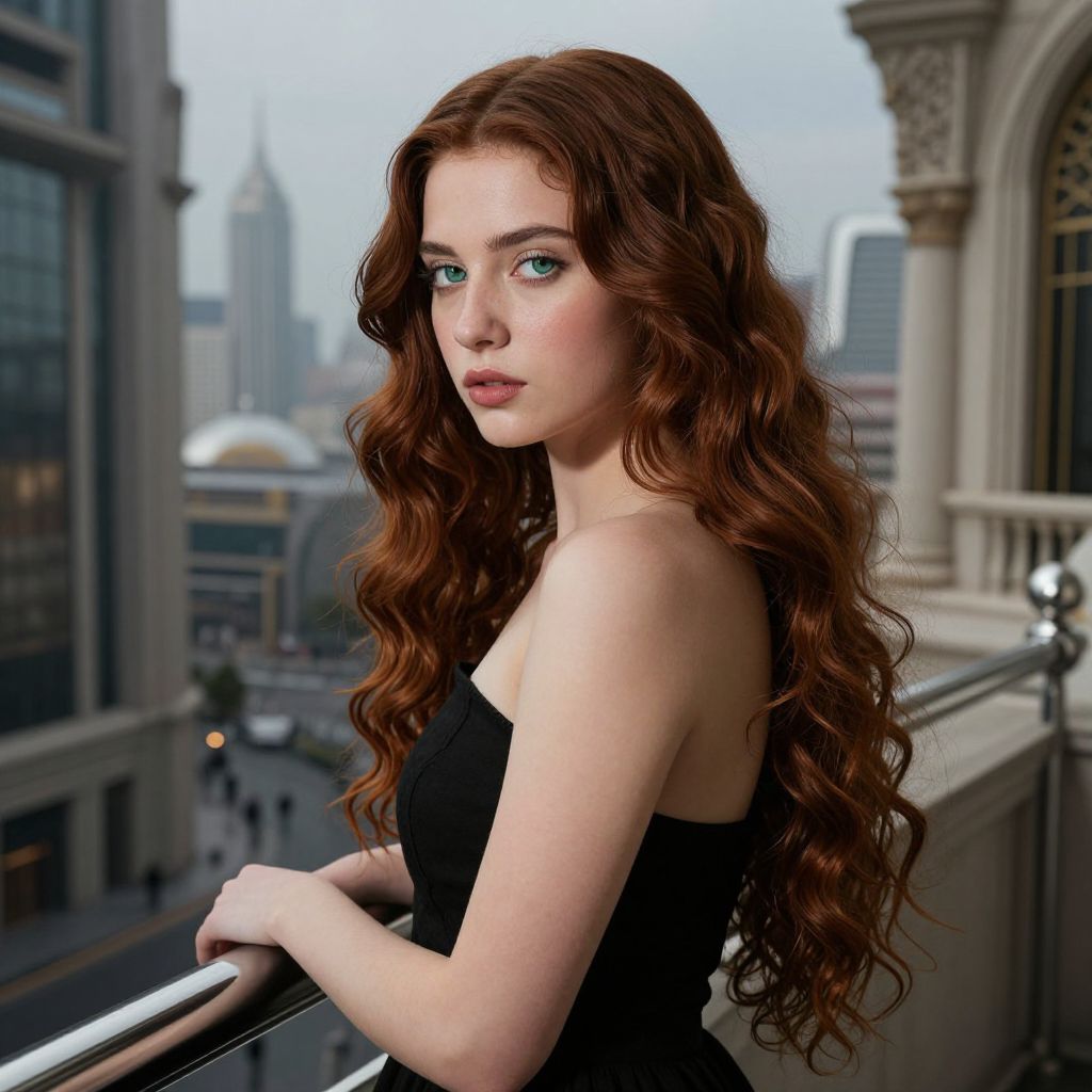 Photograph of a fair-skinned young woman with long, wavy auburn hair, wearing a strapless black dress. She stands on a balcony, looking over her shoulder with green eyes and slightly parted lips. The background shows a cityscape with tall buildings, including a dome-shaped structure and modern skyscrapers. The balcony has a metal railing, and the architectural details include ornate columns. The sky is overcast, casting a soft light on the scene. The woman's delicate features and the urban setting create a striking contrast.