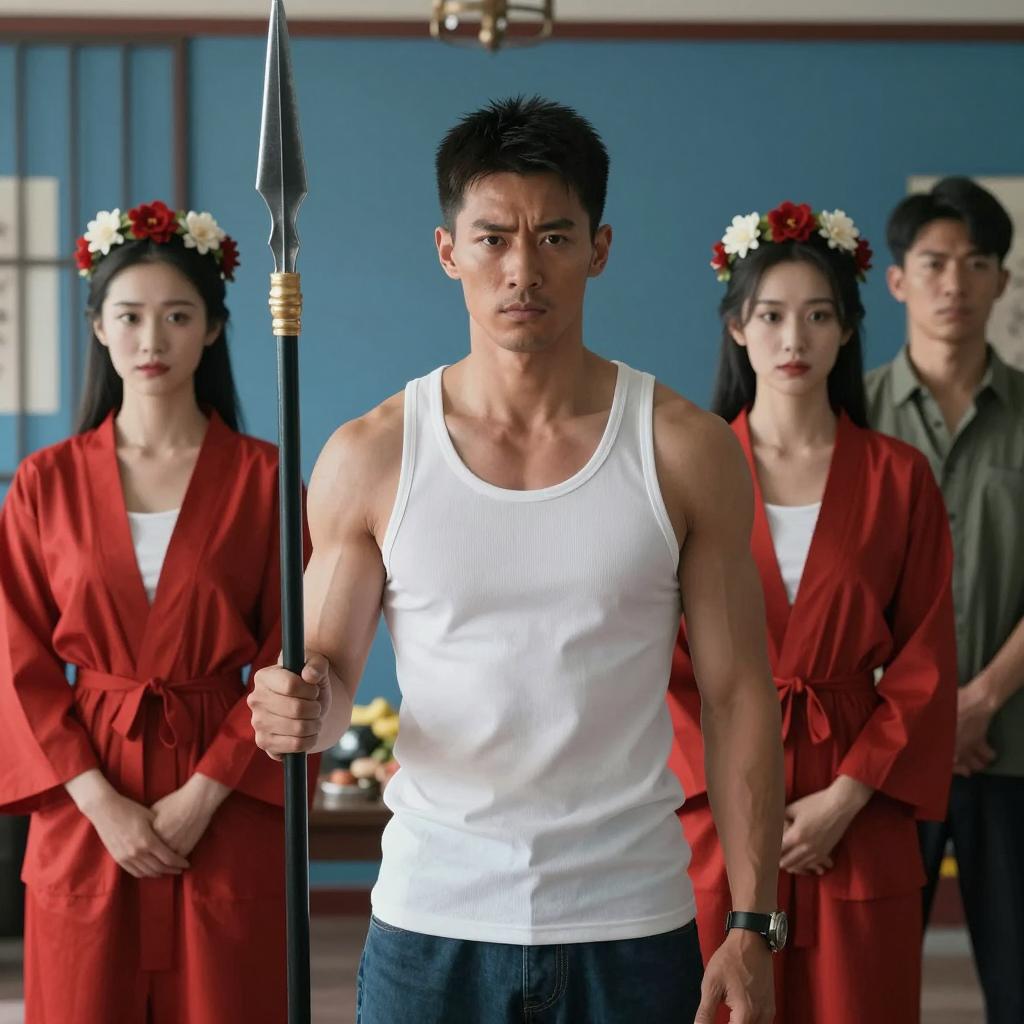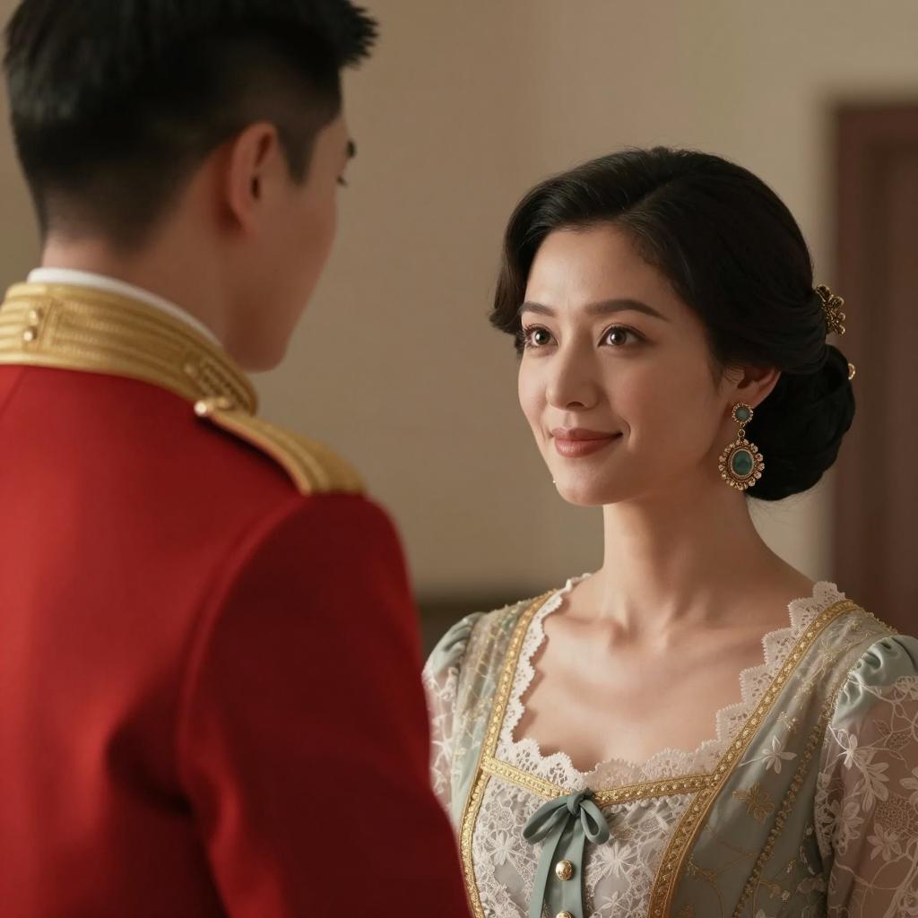 Close-up of two Asian individuals, man and woman, in an intense face-to-face interaction. Man has short black hair, glasses, black high-collared shirt, and a red bruise on his left cheek. Woman has dark hair in a bun, green high-collared dress, and slightly parted lips. Dimly lit background with blurred vertical structures. Man's face is close to woman's, creating a sense of tension.