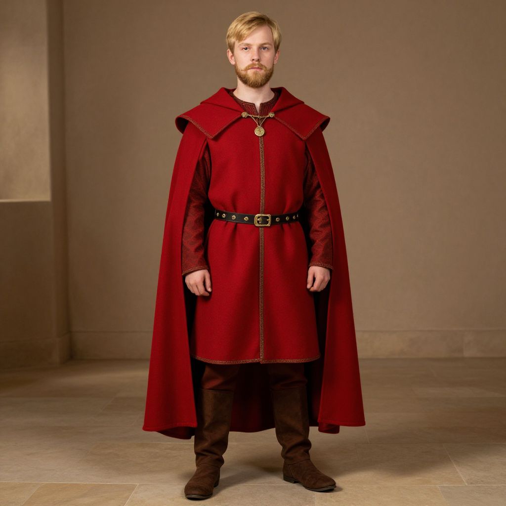Medieval baron costume, 1boy, male focus, solo, facial hair, beard, mustache, cape, boots, standing, full body, blonde hair, red cape, indoors, long sleeves, brown footwear
