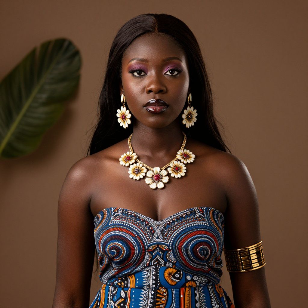 African queen attire, 1girl, solo, jewelry, dark skin, dress, dark-skinned female, earrings, flower, necklace, bare shoulders, strapless, bracelet, long hair