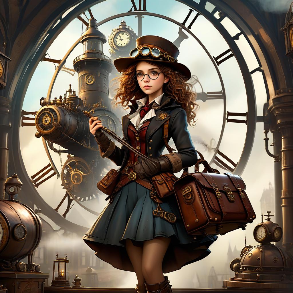 A whimsical, steampunk version of Hermione Granger, with a layered skirt with mechanical gears, an aviator hat with goggles and a leather satchel stuffed with scrolls, enchanted mechanical quill, exploring a mysterious clock tower, ticking with steam engines.