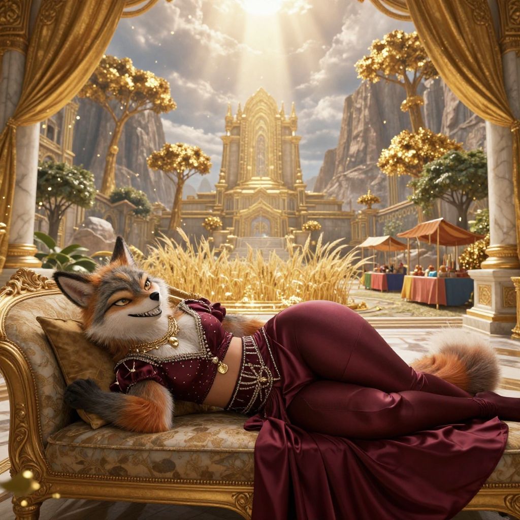 Furry fox woman lounges on ornate couch in lavish, golden cathedral courtyard, wearing red, jeweled outfit; sunlight beams down. Digital art