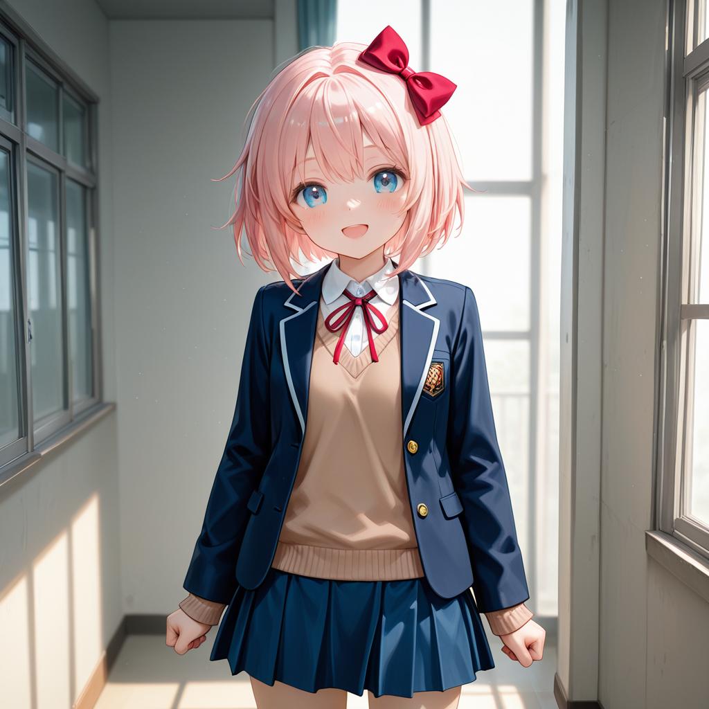2d, masterpiece, best quality, anime, highly detailed, cowboy shot, 1girl, solo, sayori, blue eyes, pink hair, short hair, hair bow, red bow, school uniform, blazer, brown sweater, collared shirt, neck ribbon, blue skirt, standing, clenched hands, :d