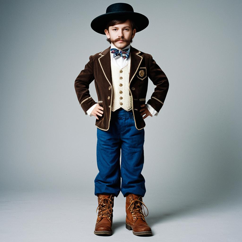 Full body portrait of a young boy wearing a traditional vintage American-style costume including a dark brown jacket with gold trim, cream-colored waistcoat, white shirt, blue pants, brown boots, and a black wide-brimmed hat. The boy has styled hair, a mustache, and stands confidently against a grey background.