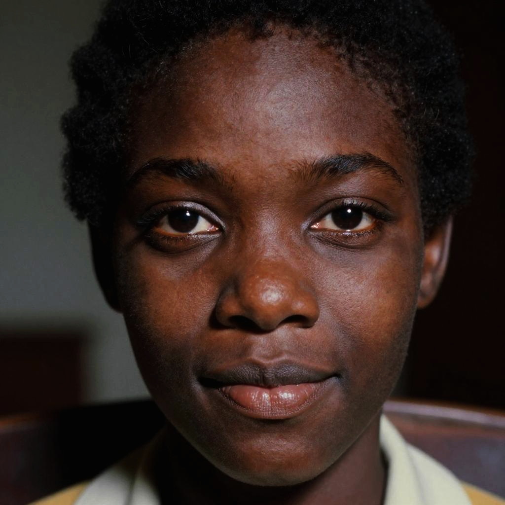 (close-up, editorial rz884n4l0g photograph of a 20 year old woman from the 70s), (((black african ebony))), (highly detailed face:1.4) (smile:0.7) (background inside dark, moody, POV, by lee jeffries, nikon d850, film stock photograph, 4 kodak portra 400, camera f1.6 lens, rich colors, hyper realistic, lifelike texture, dramatic lighting