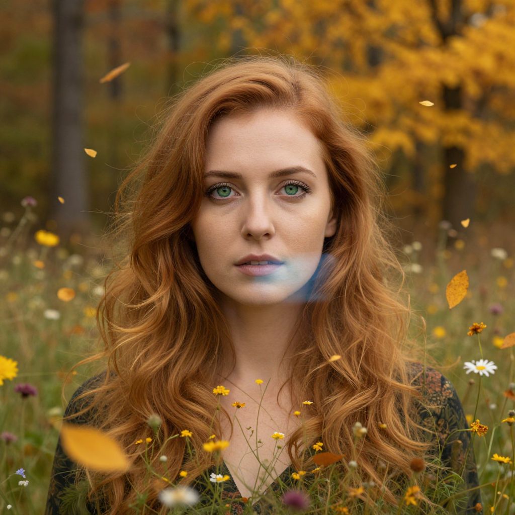 Photograph of a fair-skinned, red-haired woman with green eyes, standing in a vibrant autumn meadow filled with yellow and white wildflowers.