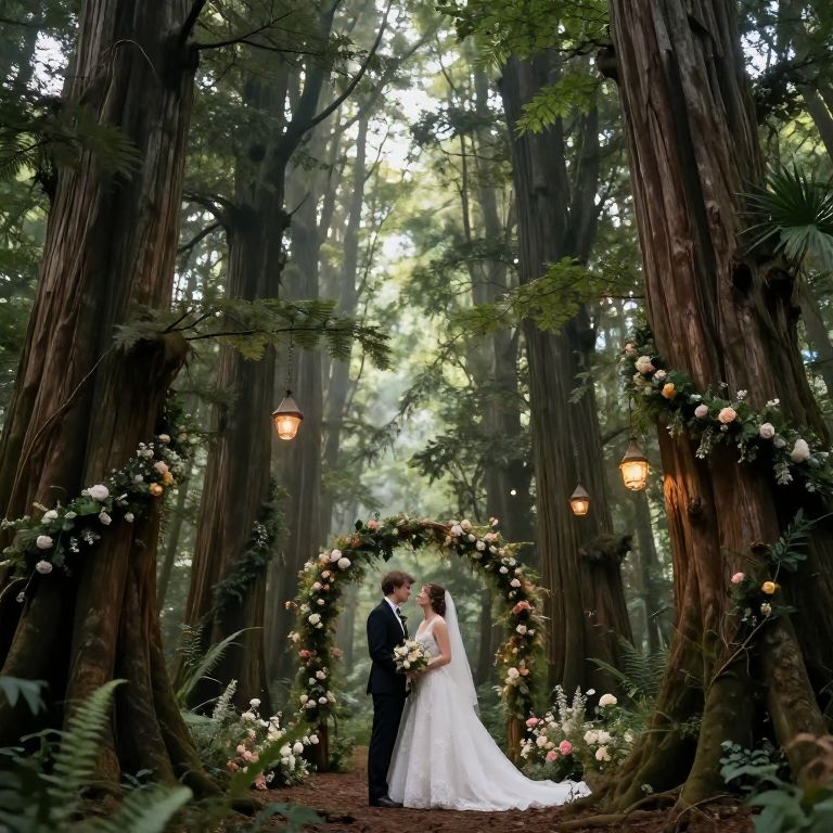 Background wedding pictures portraying an enchanted forest with towering ancient trees, soft rays of sunlight filtering through the leaves, delicate hanging lanterns, and whimsical floral garlands, creating a magical and fairytale-like wedding setting.