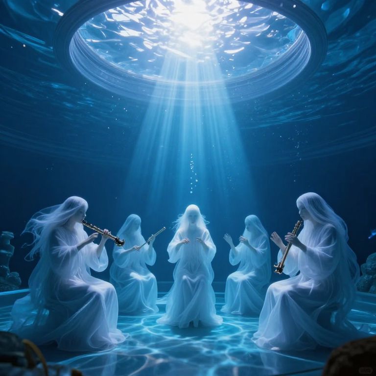 An ethereal underwater chamber bathed in azure light, where ghostly musicians in flowing robes perform a silent symphony beneath a luminous, sunlit dome.