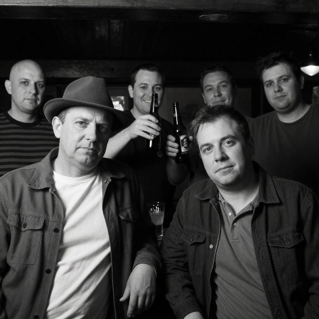 Black-and-white photograph of six men in a bar. Foreground: man in hat, jacket, and shirt, looking serious. Background: man holding beer bottle, raised in toast, smiling. Others: bald man, man in striped shirt, men with neutral expressions. Wooden ceiling, bar setting.