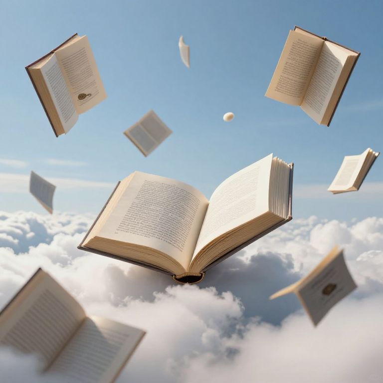 Photorealistic CGI image of open books floating in a bright blue sky with fluffy white clouds. Eight books, with visible text and gold edges, are dispersed at various angles, some tilted, others flat, against the serene sky. The largest book is centered, open, and illuminated, casting a soft glow. Smaller books surround it, creating a sense of weightlessness and motion. The scene evokes a dreamy, ethereal atmosphere, blending the tangible with the abstract.