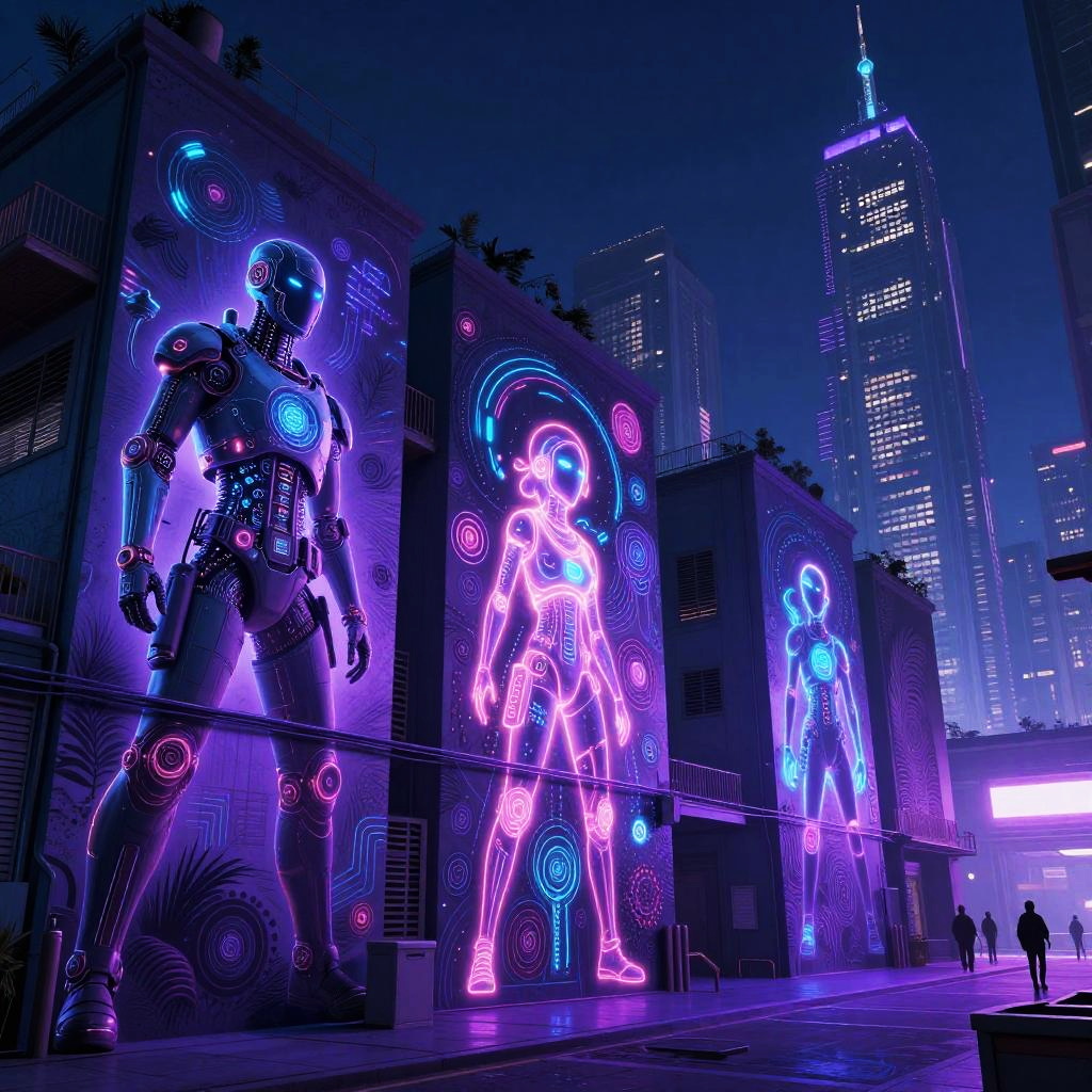 Draw AI art illustrating a neon-lit cityscape where AI-powered street artists bring walls to life with glowing murals, combining futuristic tech and organic creativity, dynamic perspectives, vibrant purples and blues, cyberpunk vibes with intricate detailing on walls and characters.