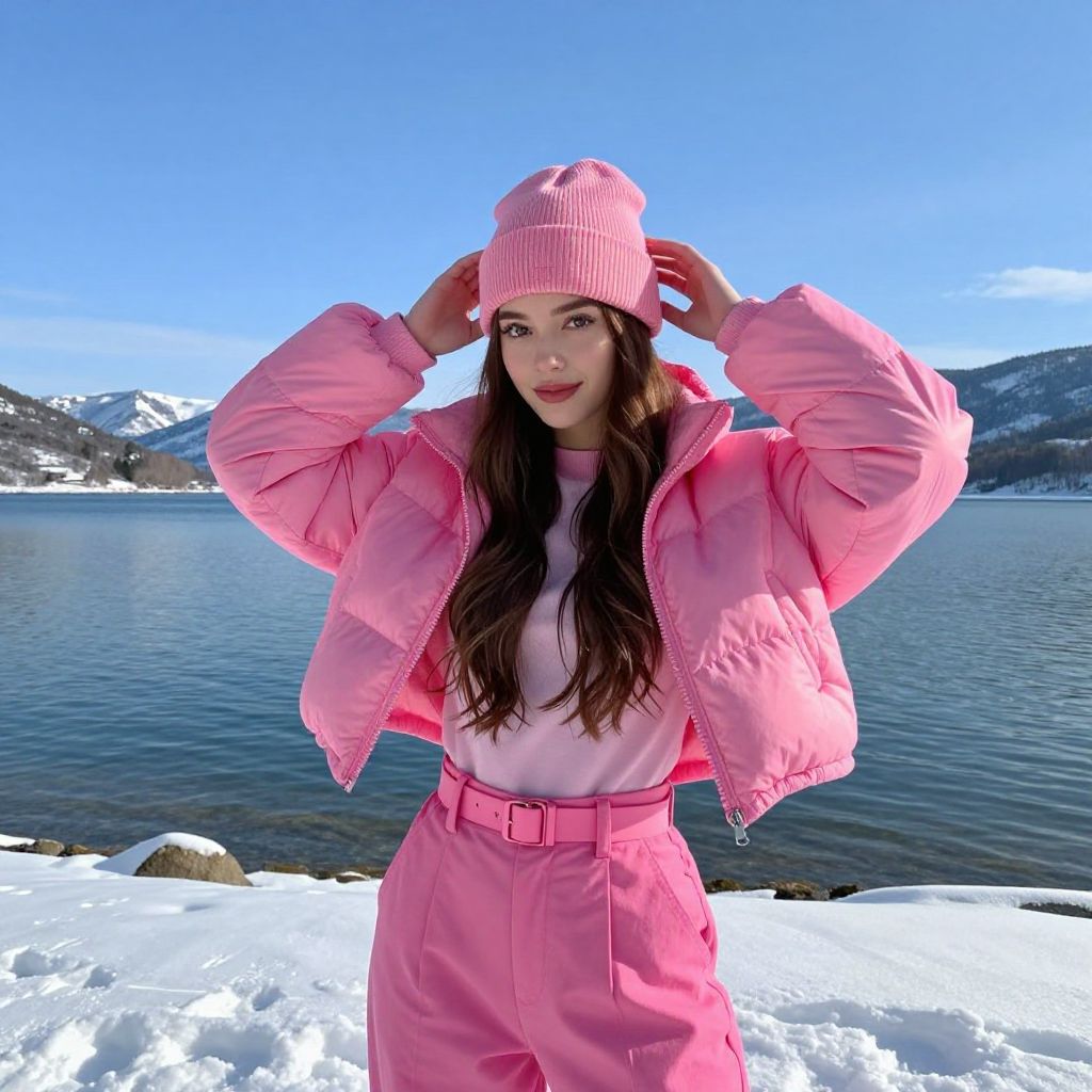 Photograph of a young woman standing in front of a snowy lake with mountains in the background. She has long brown hair, fair skin, and is wearing a pink puffy jacket, pink high-waisted pants, and a matching pink knit beanie. Her hands are adjusting the beanie. She has pink lipstick and a calm expression. The sky is clear and blue, contrasting with the white snow and dark blue water. The overall style is vibrant and winter-themed, emphasizing pink and blue colors.