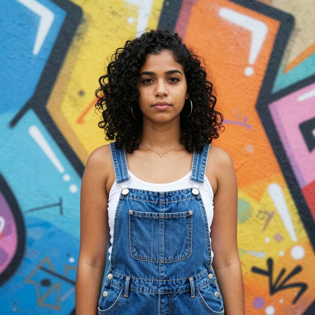 Photograph of a young woman with curly black hair, wearing a white lace crop top and distressed blue jeans, standing in front of vibrant graffiti on a