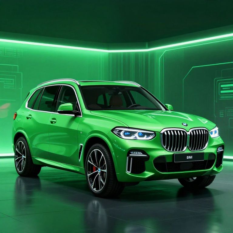 A sleek BMW X5-inspired SUV bathed in vibrant CityBeam green illumination, featuring dramatic neon lighting effects and a high-definition, computer-generated aesthetic that captures the essence of modern automotive design and cyberpunk-inspired visuals.