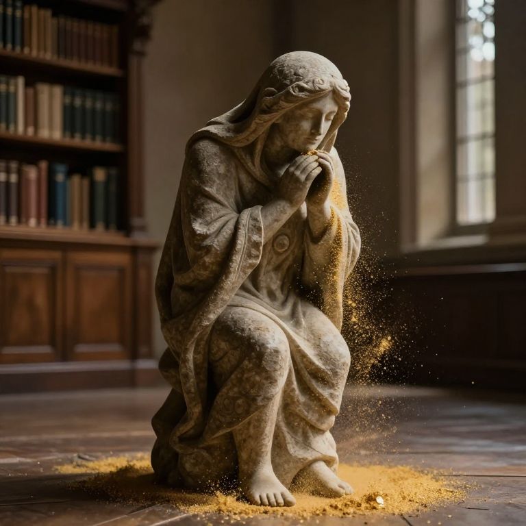 Photograph of a stone statue of a sorrowful, robed woman kneeling with her hands clasped to her chest, illuminated by golden light. She has a contemplative expression and wears a veil. Sparks of light surround her, creating a glowing effect. The background features a dimly lit, wooden-paneled library with tall bookshelves and a large window. The statue is positioned in the center, with the light source coming from the right, highlighting the texture of the stone and the folds of her garment. The floor is dark, contrasting with the bright, golden light around the statue.