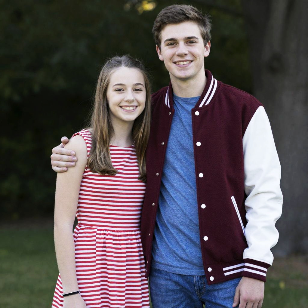 Photograph of two people on a football field at night. A man in a maroon football jersey with number 13, seen from the back, stands facing a smiling woman in a maroon and white cheerleading uniform. She has light brown hair in a ponytail, arms crossed. Background includes illuminated trees and field. Man's hair is blond and slightly messy. Woman's expression is joyful.