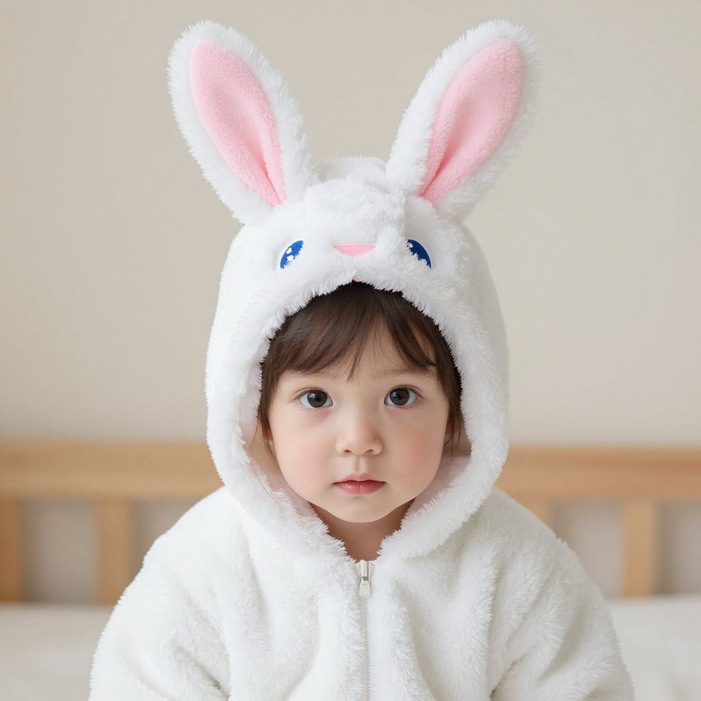 Photograph of a young child with fair skin and dark brown hair, wearing a white, fuzzy, hooded bunny onesie with pink inner ears. The child has large, round blue eyes and a slightly open mouth. The hood has blue eyes embroidered on the front. The background is a simple, light-colored wall with a wooden headboard at the top of the frame. The child is centered in the image, looking directly at the camera with a neutral expression. The lighting is soft, highlighting the child's face and the fluffy texture of the onesie.